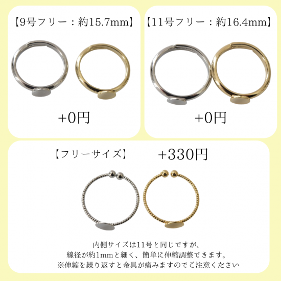 11号サイズorフリーサイズリングご希望の場合は「カートに入れる」ボタンの少し上にある「金具変更」のブルダウンメニューより変更いただいた上で、カートに入れてください。