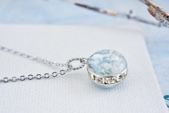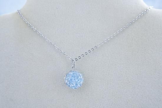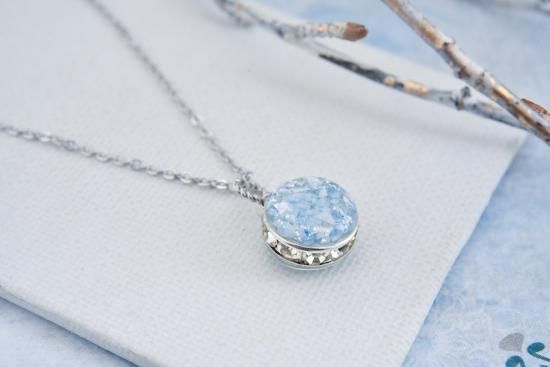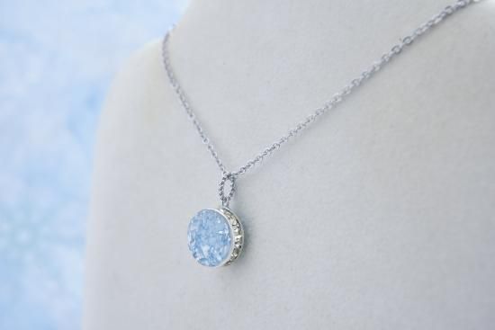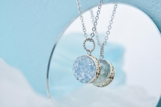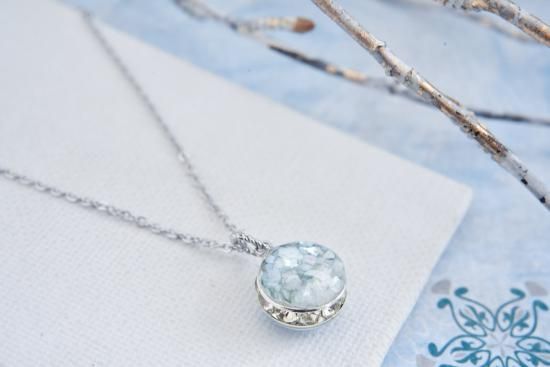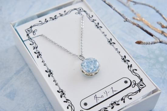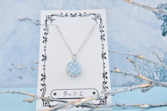 周りにぐるりと雪のような白のシェルや銀箔、空色の箔を配置しました。