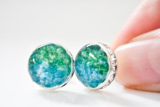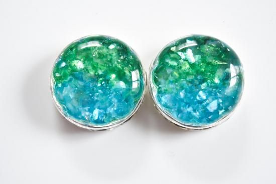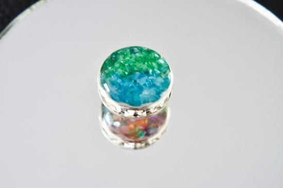 川イメージの色には水色に染めた着色レジンと暗め水色のガラスを重ね、