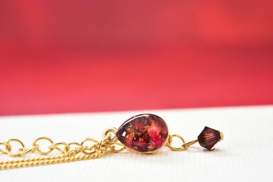 ワイン色や赤のシェル、ワイン色のメタル素材、紫や橙色のガラスを織り混ぜることで、