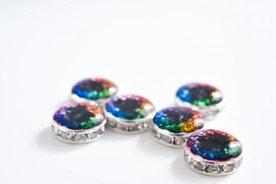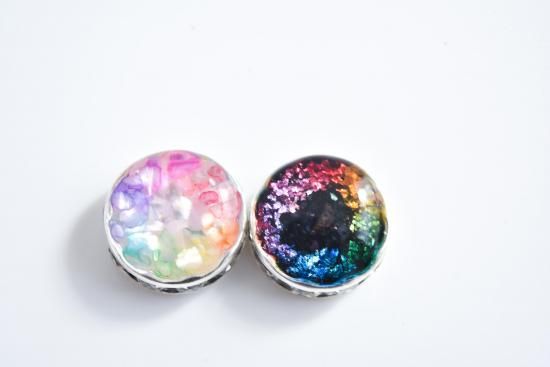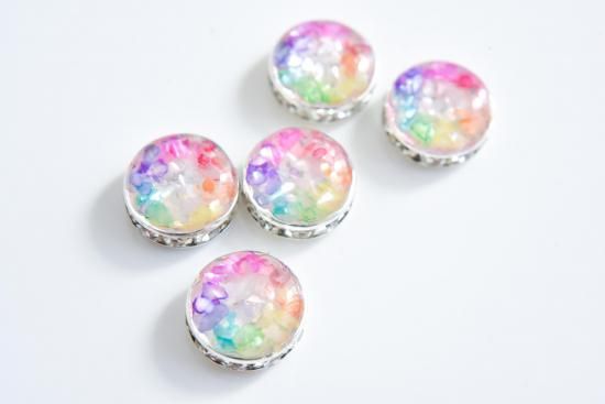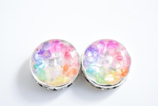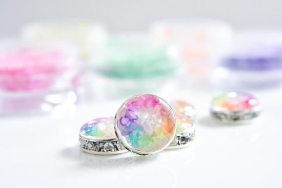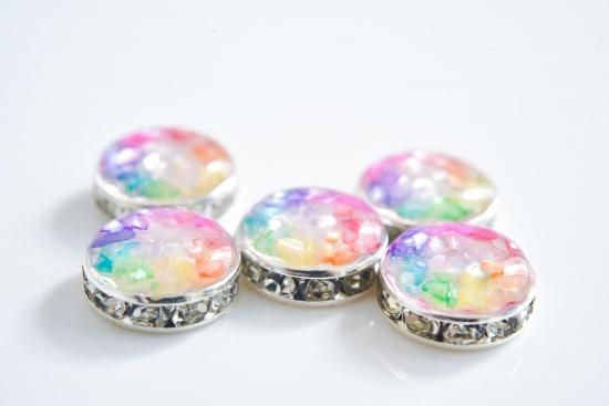 その上に、赤、黄色、緑、青、赤紫の5色の着色レジンを重ねて作りました。