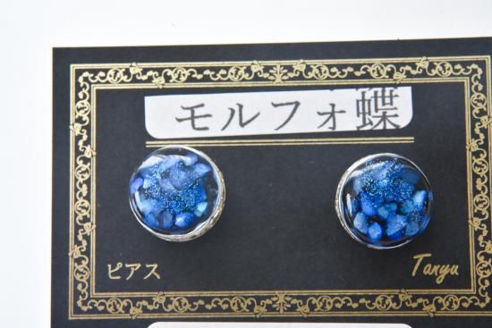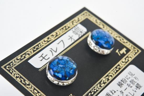 鱗粉に見立てたブルーオーロラのグリッターを重ねて作っています。